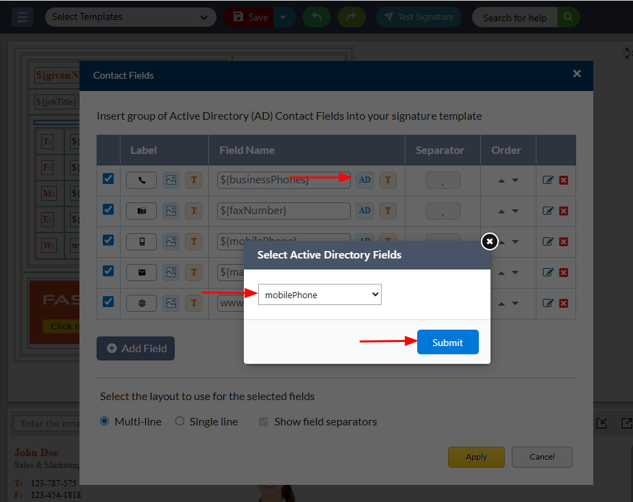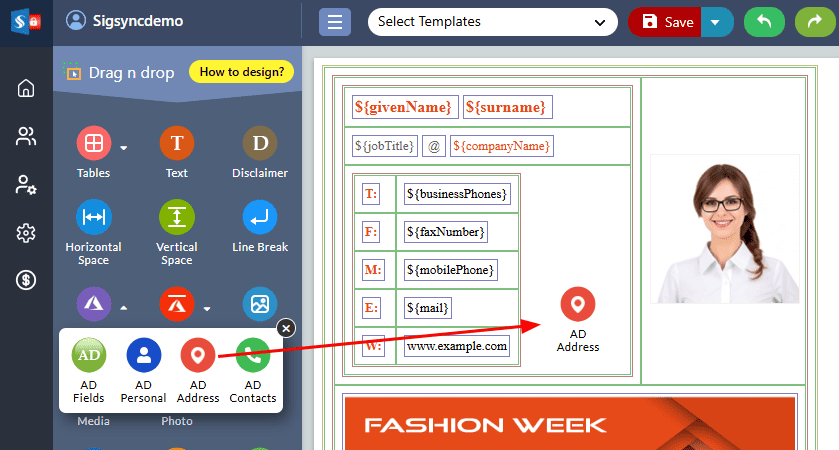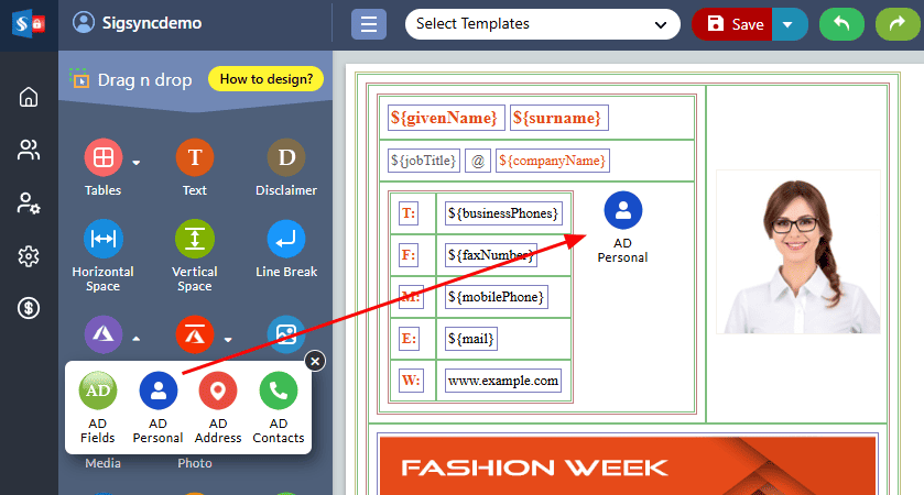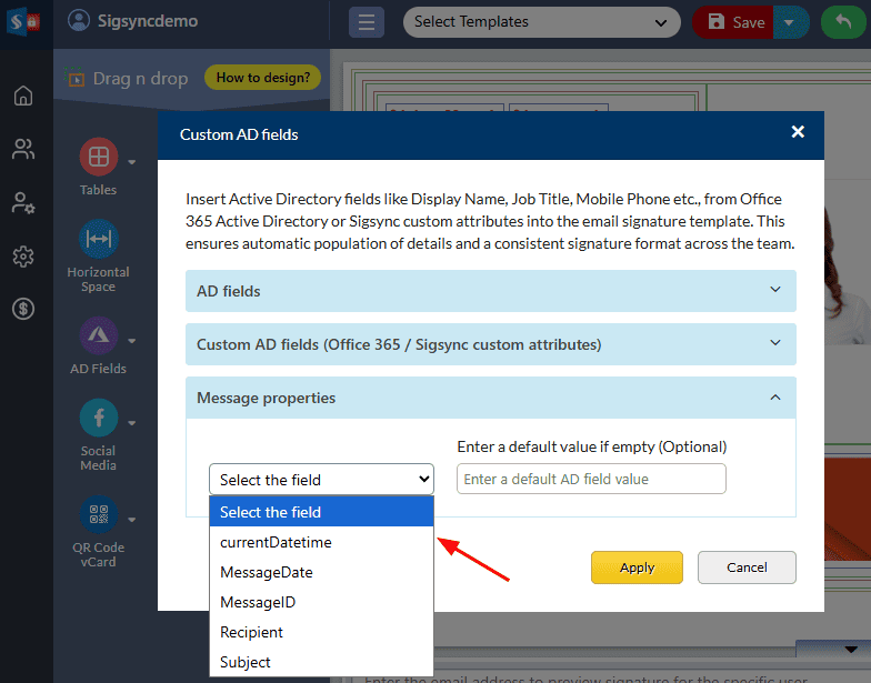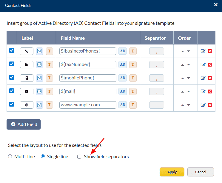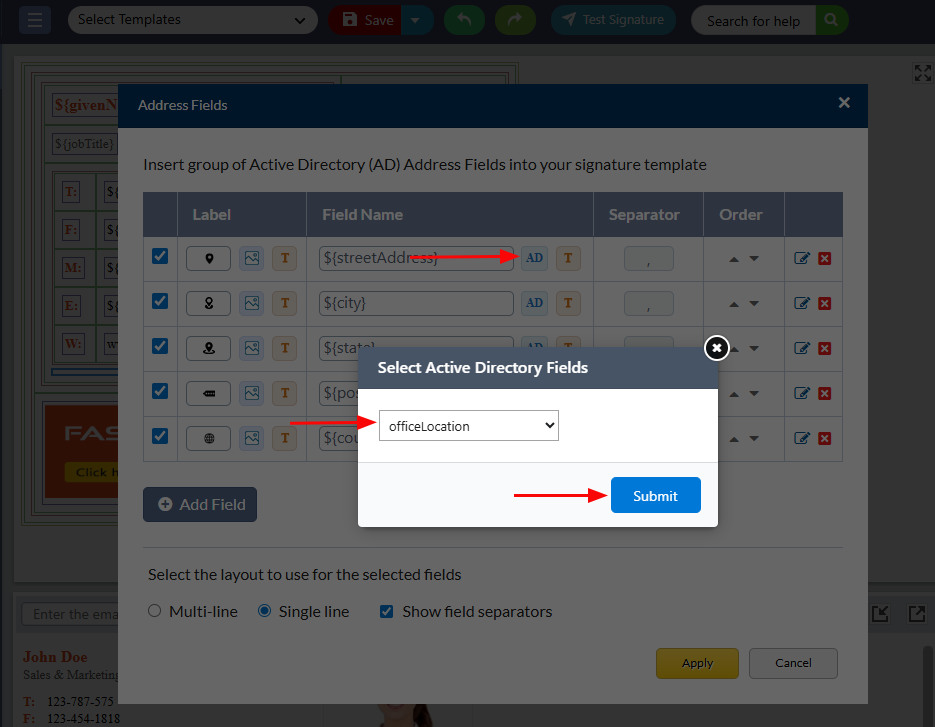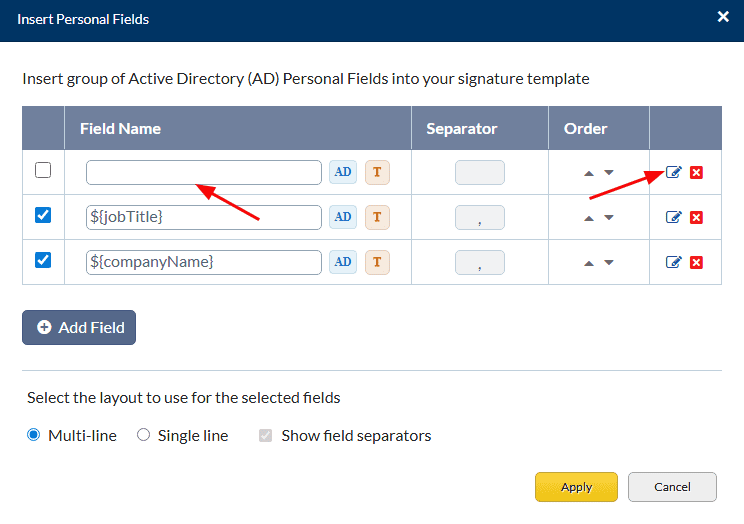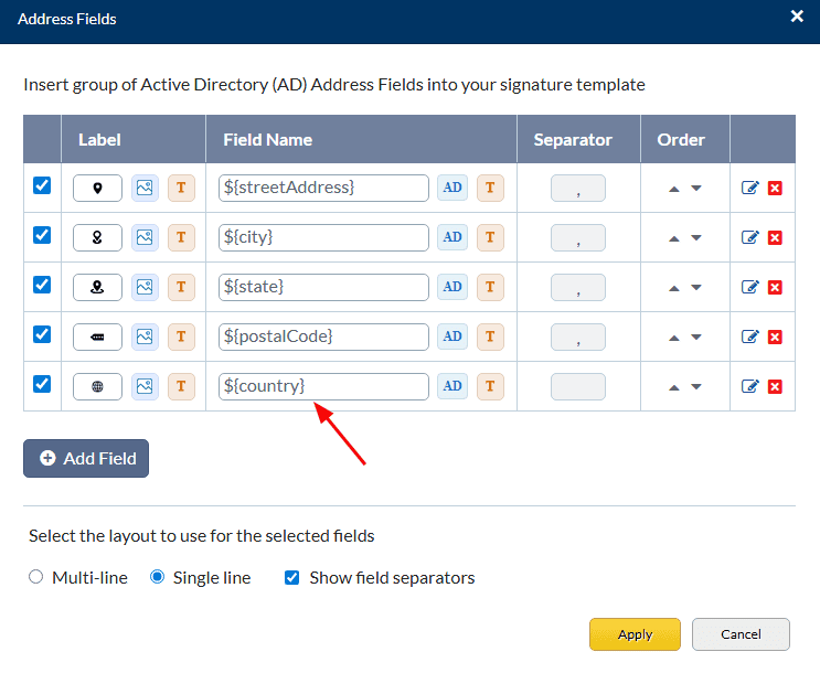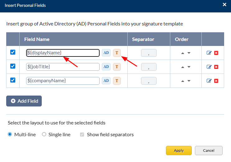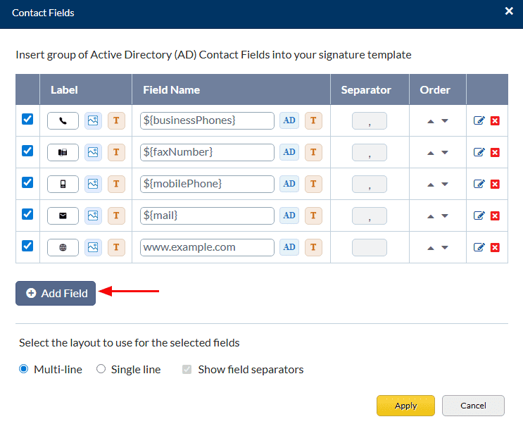 To insert an ‘Active Directory (AD)’ field in your signature template, follow the steps below.
