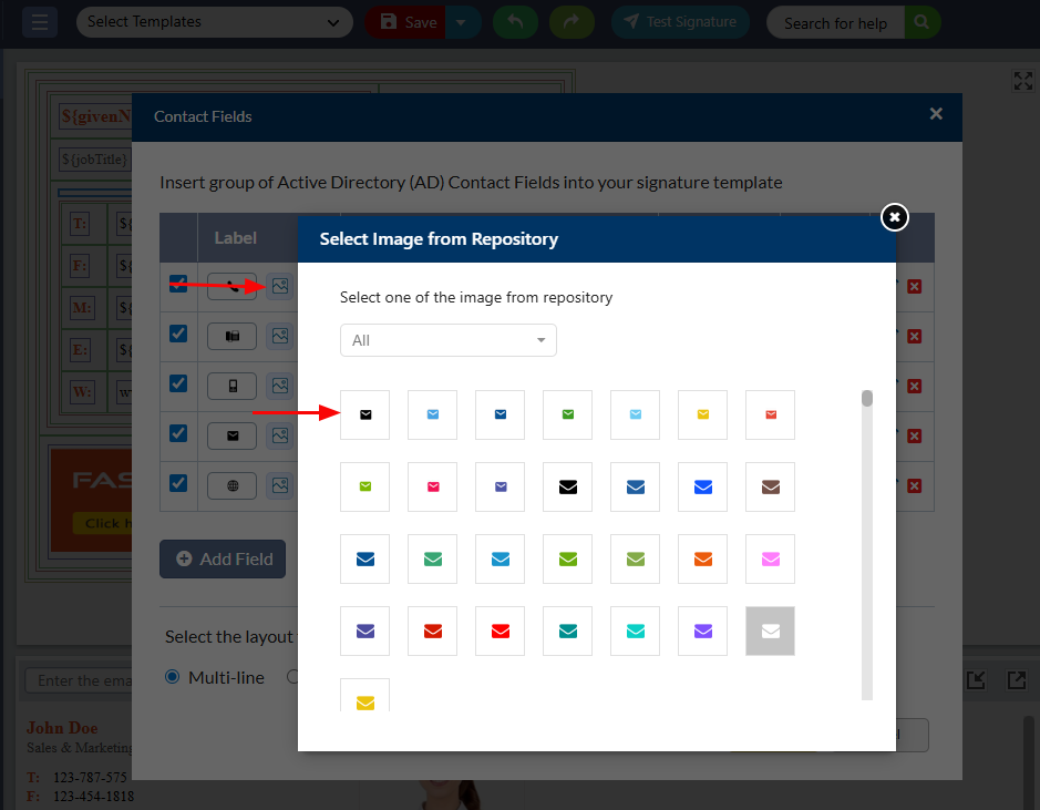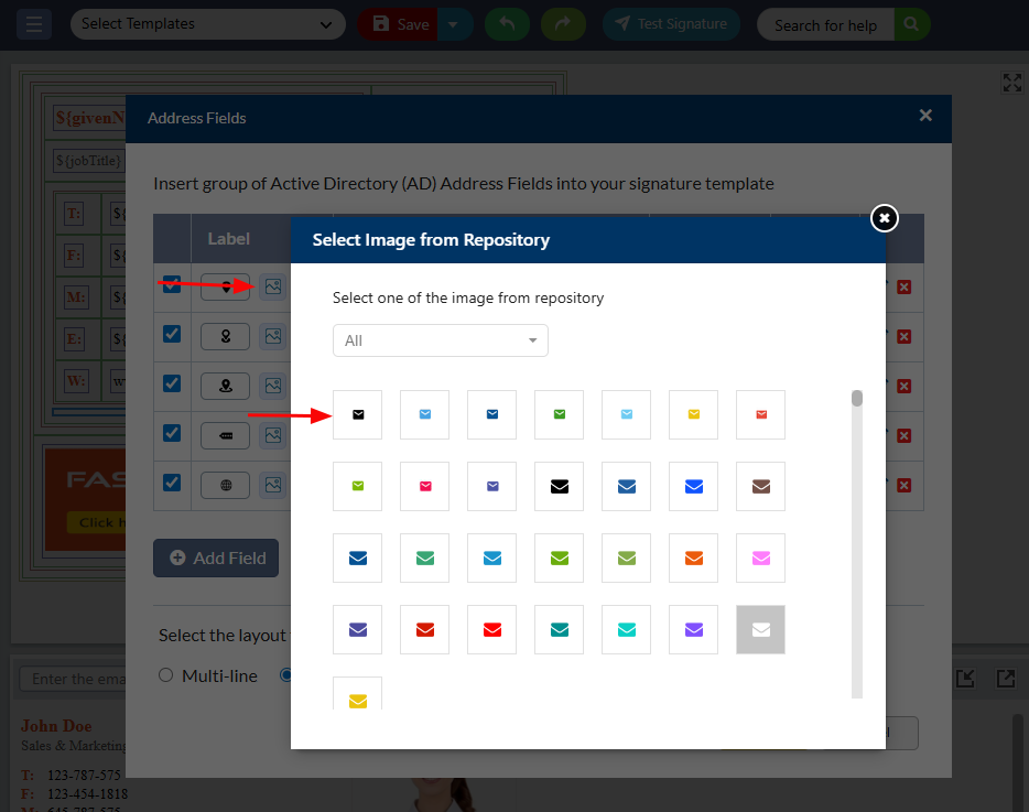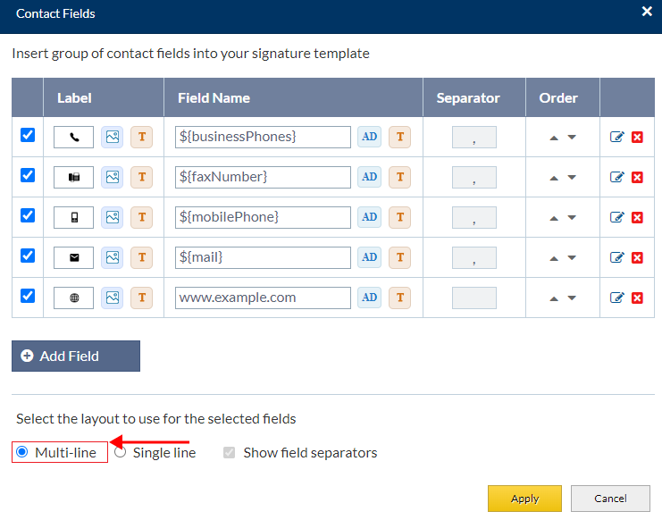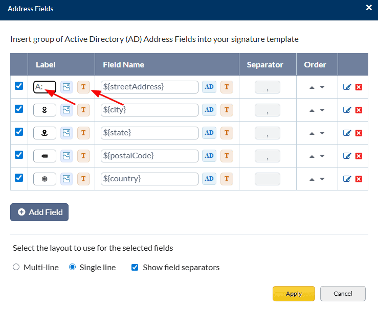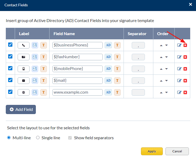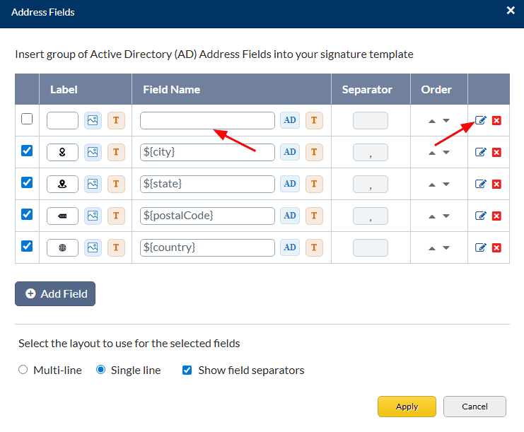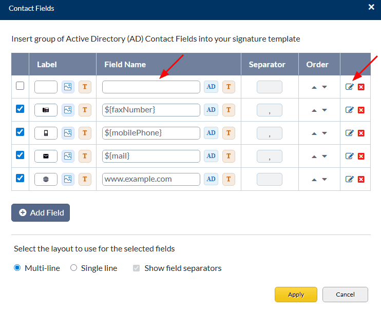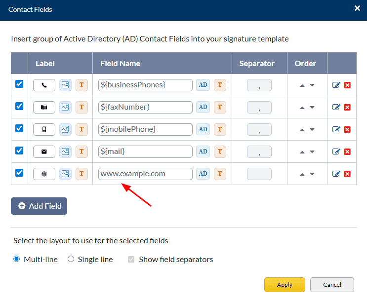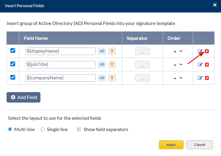 To insert an ‘Active Directory (AD)’ field in your signature template, follow the steps below.