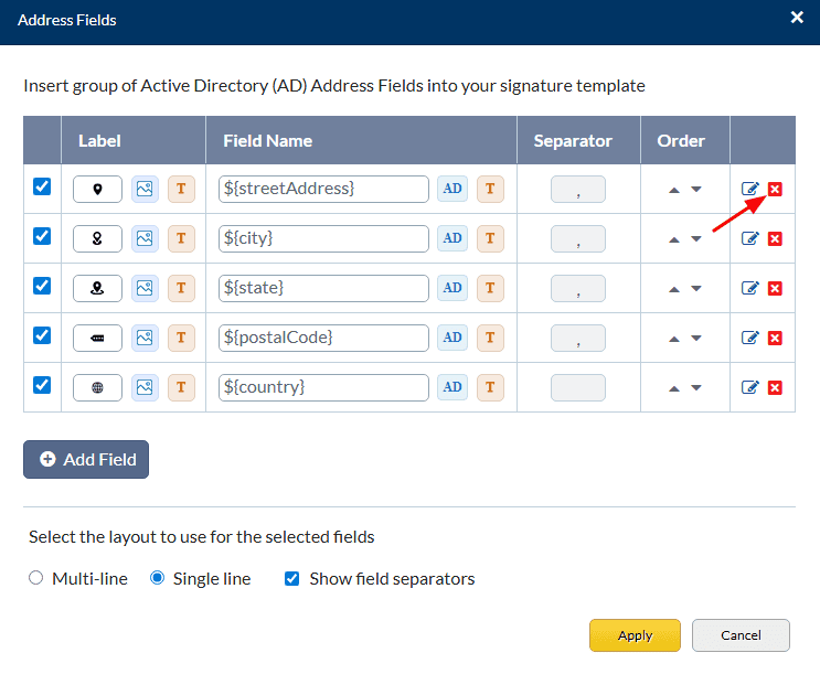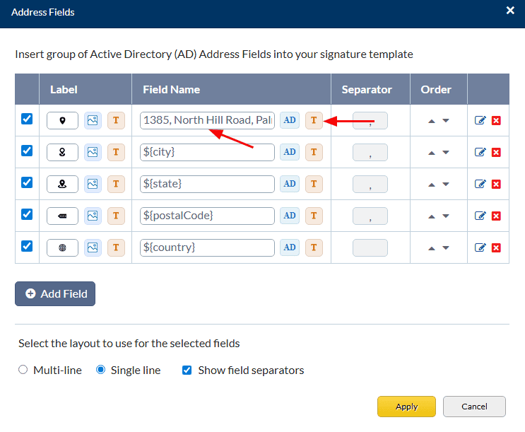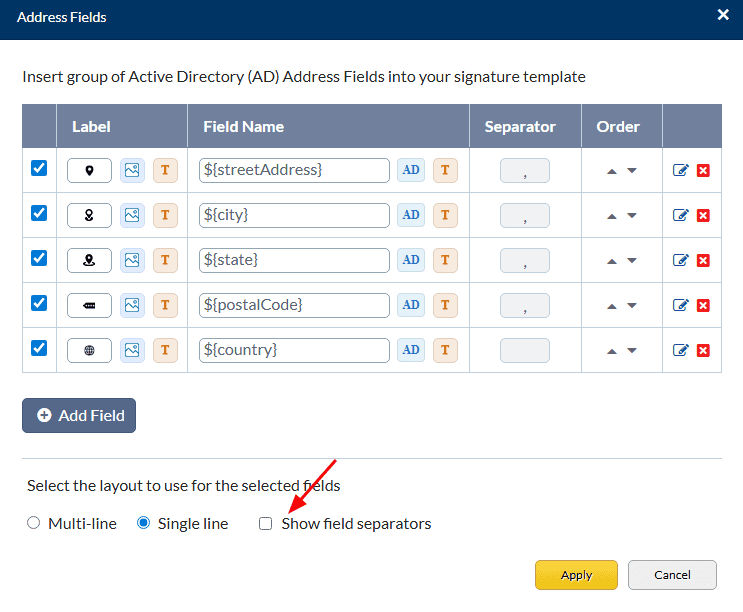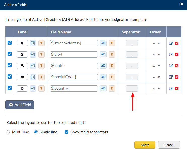 All the selected ‘Address Fields’ will be displayed in a single line with a field separator to differentiate between the fields.