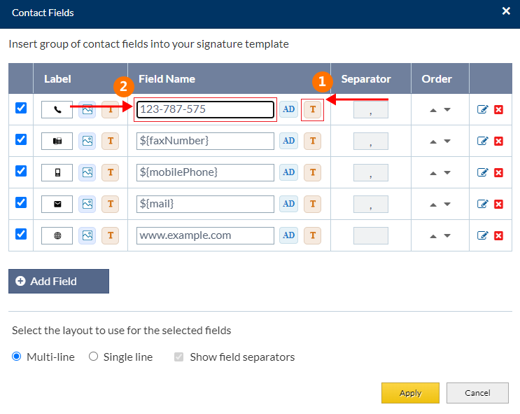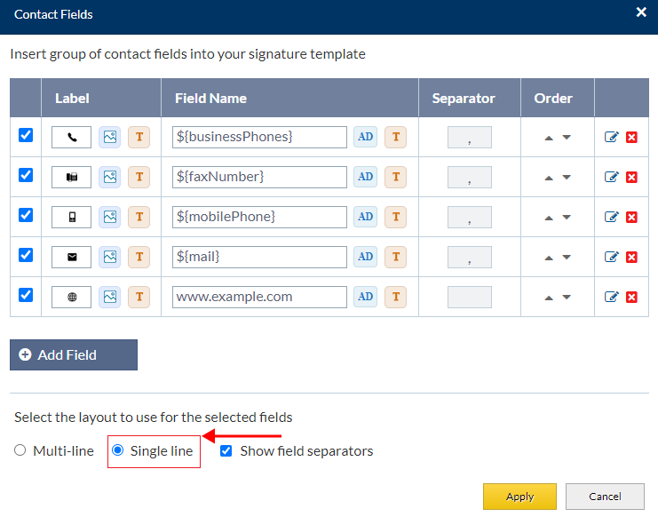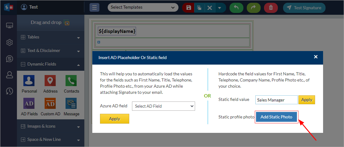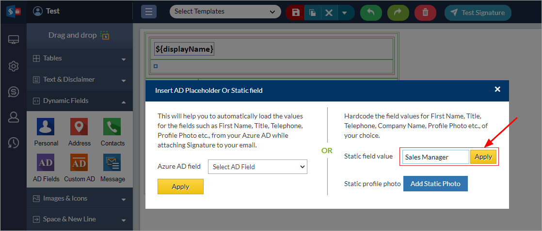 - Static Field: Convert a dynamic Active Directory field into static text, which enables you to showcase information that doesn't frequently change in your signature.
