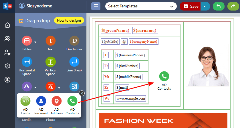‘AD Fields’ component pulls your Active Directory details such as name, profile image, job title etc. and dynamically loads those details in your email signature template.