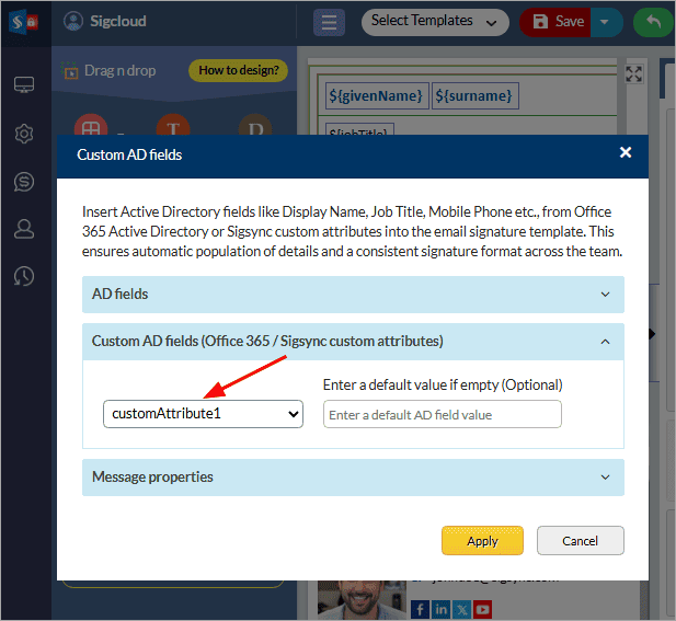 The ‘Custom AD‘ component allows you to insert custom attributes in the signature template. It automatically fetches the details from your Office 365.