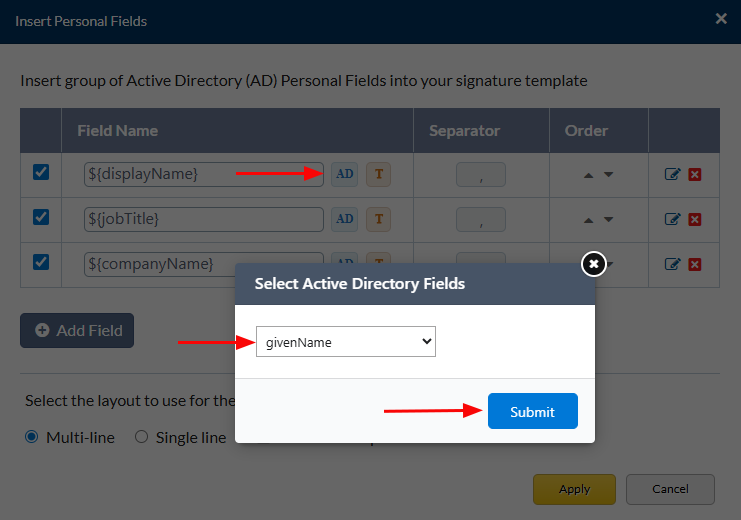 - Select the desired Active Directory field from the dropdown list and click the ‘Apply’ button