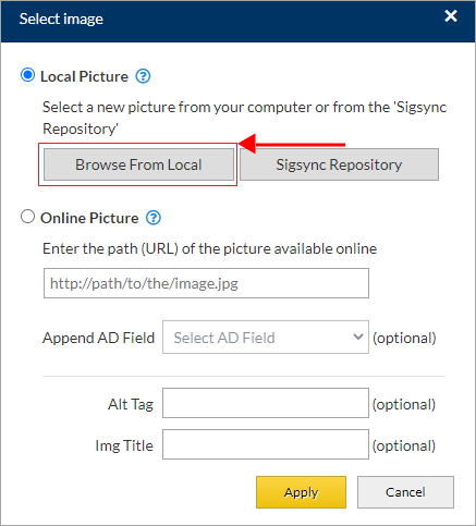 - You can either load required images from your local drive, online URL or Sigsync repository.