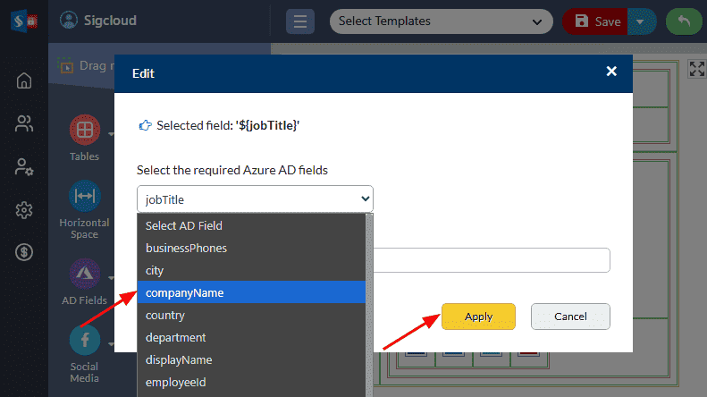 - Click the edit icon, choose ‘companyName’ from the Azure AD fields, and then click ‘Apply’.
