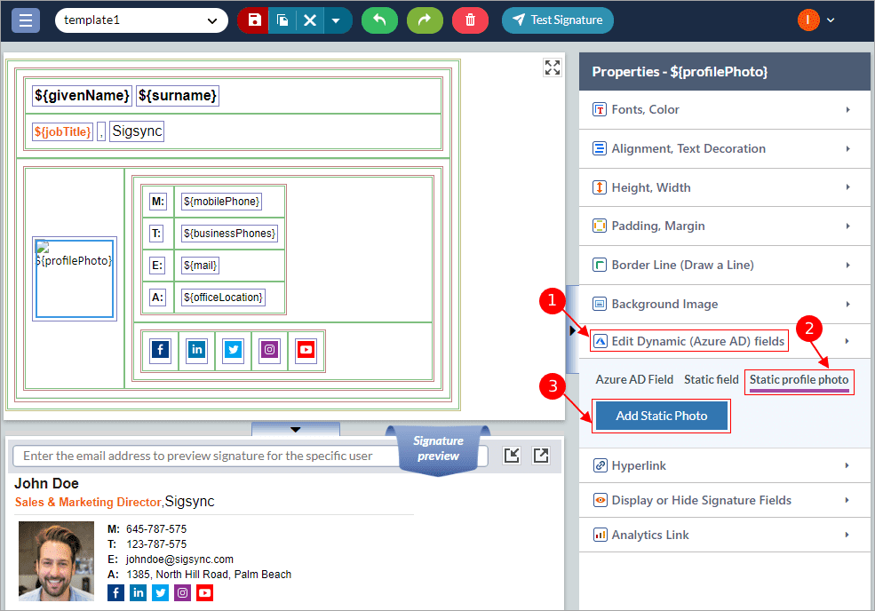 ‘Static Profile Photo’ allows you to add a static profile photo in your email signature, which can be useful when you want to use a specific profile photo for a user that differs from the photo stored in Azure Active Directory.