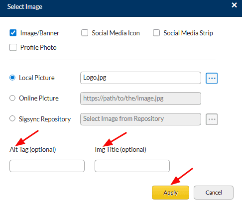 - Assign the logo image an Alt Tag and Image Title, then click the 'Apply' button