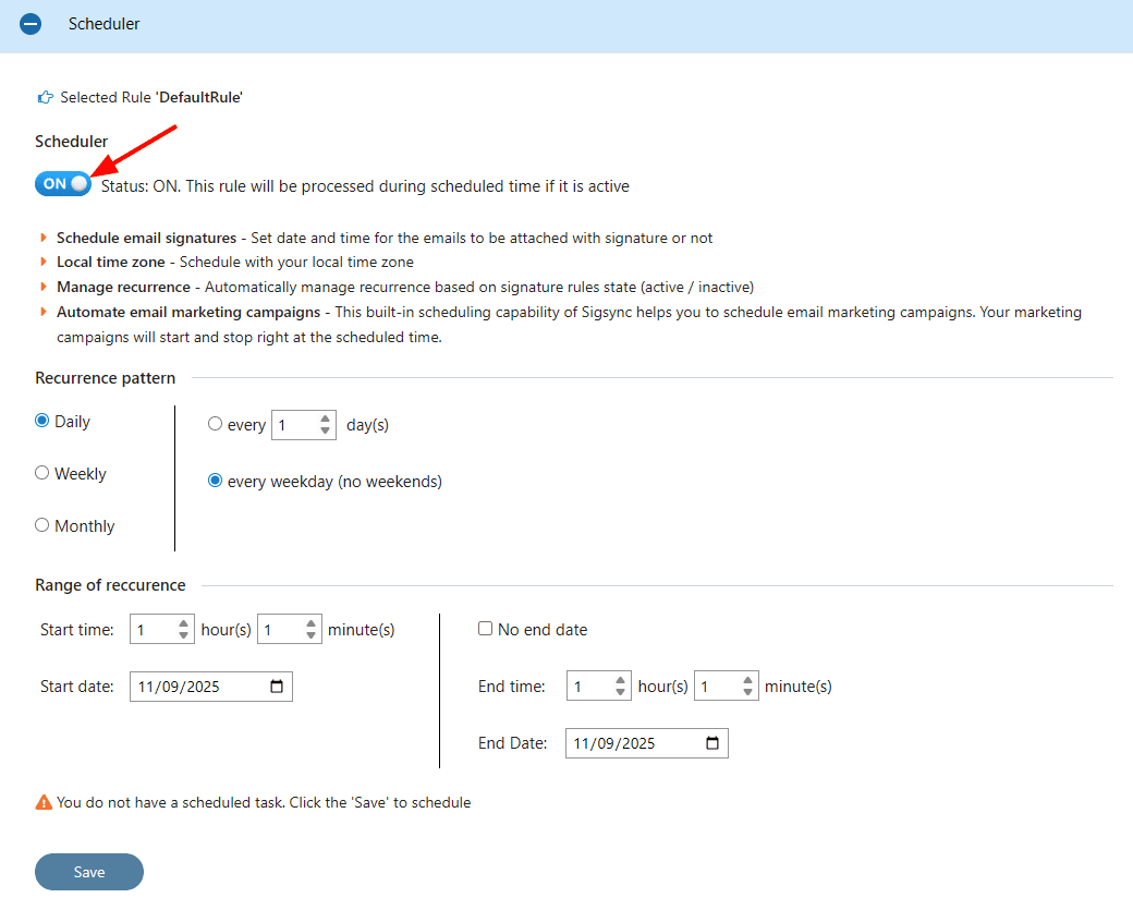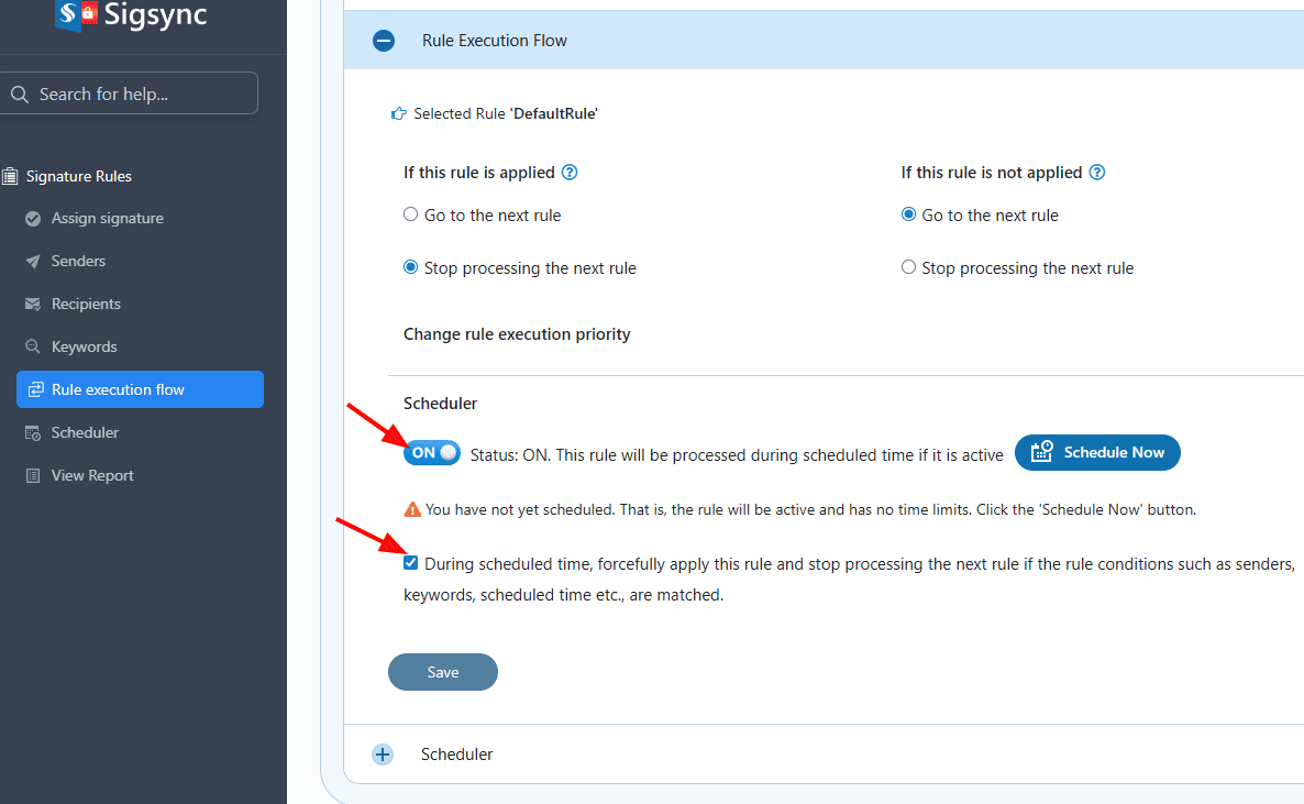 The 'Scheduler' is part of 'Signature Rules' which decides when the rule should be applied. Each rule can have its own scheduler to schedule the timing to apply signatures from that rule. It is possible to create on a daily, weekly and monthly basis. Make sure you have turned on the Scheduler after it has been set. If the