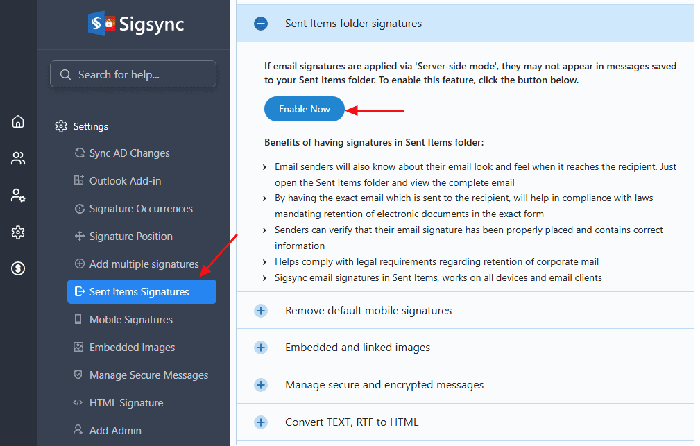 - To enable the signatures in the ‘Sent Items’ folder, go to Sigsync ‘Settings’ and select ‘Sent Items Signatures’.