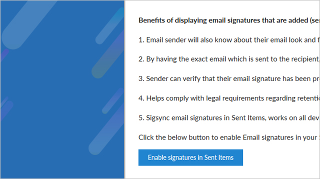 Never miss an important legal disclaimer in your emails again with Sigsync Email Signatures for Office 365! Keep a complete record of your communication for verification purposes and easily preview the signature that was sent to the recipient by enabling the ‘Sent Items’ signature option.