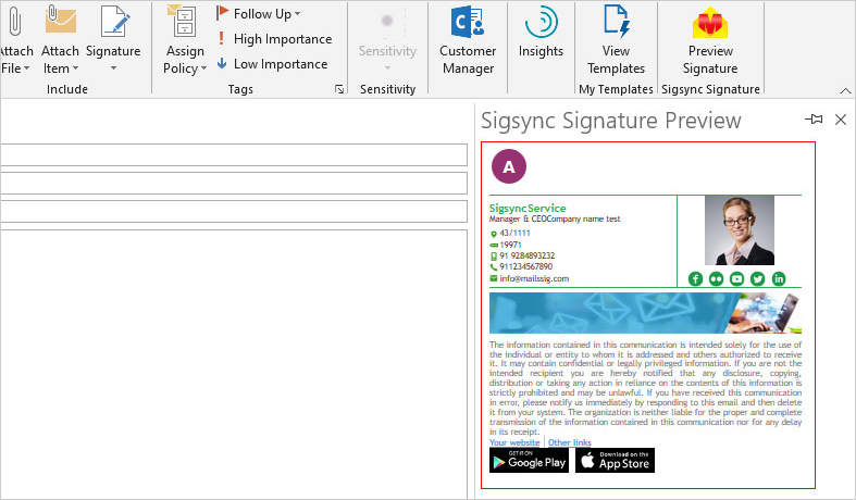 Sigsync Email signatures for Office 365 is a server-side service that provides a company-wide centralized email signature for Office 365 tenants. Once you have finished the configuration and set a signature, you can view the signature preview of signature that will be attached to email by installing Sigsync Outlook add-in.