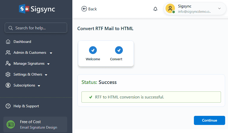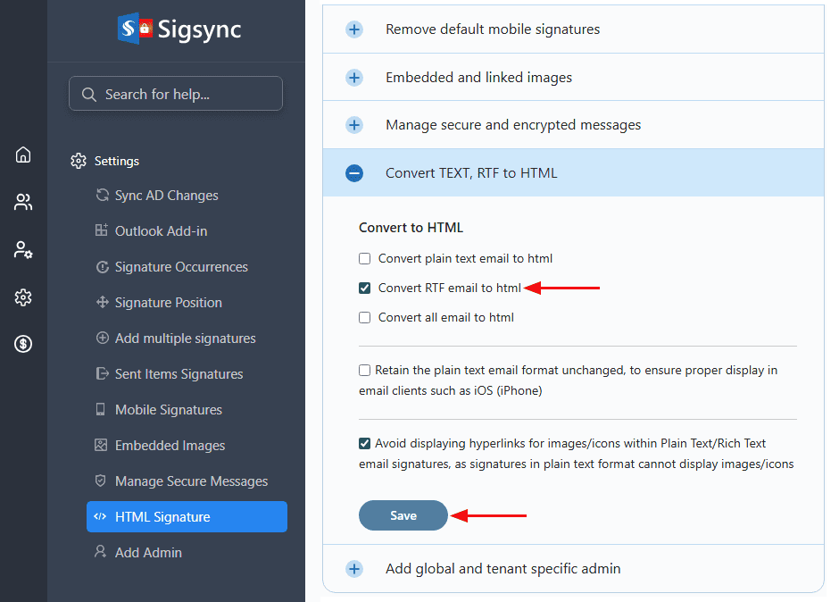 These options in the Settings section allow you to have signatures on any email without limitations of email being only text or RTF format etc. If no email convert option is selected, then only HTML emails will have HTML signatures. Text emails will have text signatures and RTF will not have any signature. You have to convert RTF email to HTML email to add the signature.