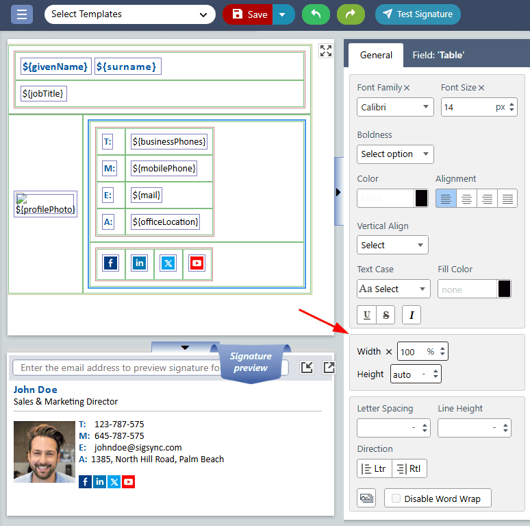 The 'Height, width, and padding' properties allow you to adjust the size and spacing of the signature field to fit seamlessly into your email signature.