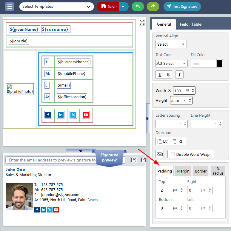 By adjusting these padding properties, you can ensure that the signature field is positioned and spaced correctly, resulting in a more professional and polished appearance for your emails.