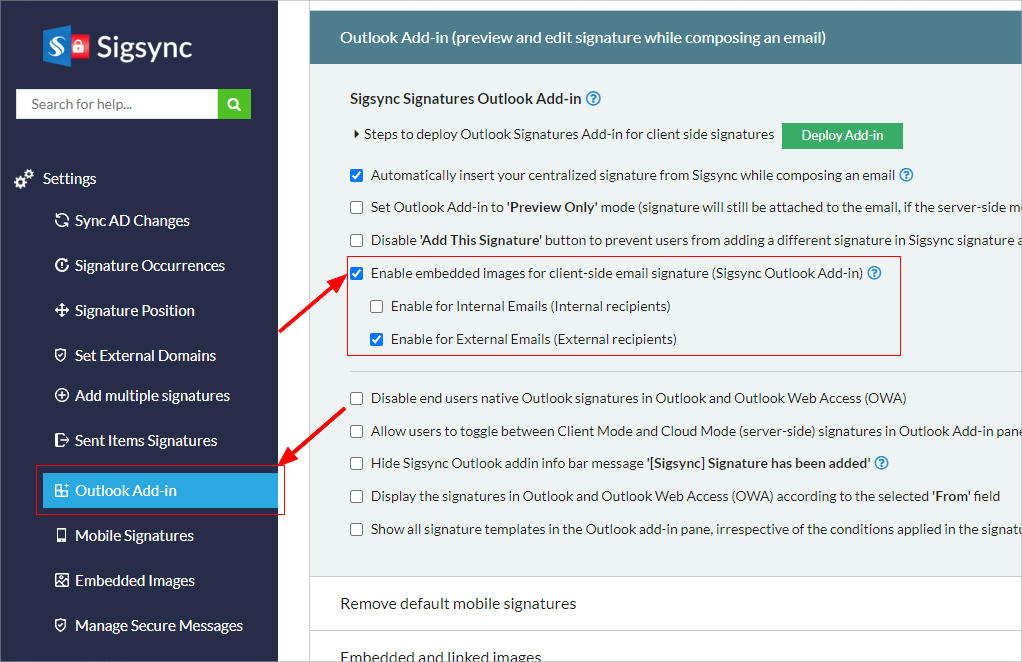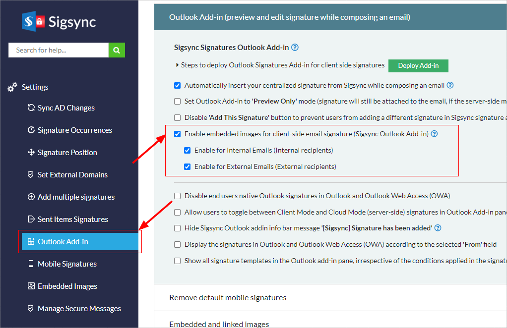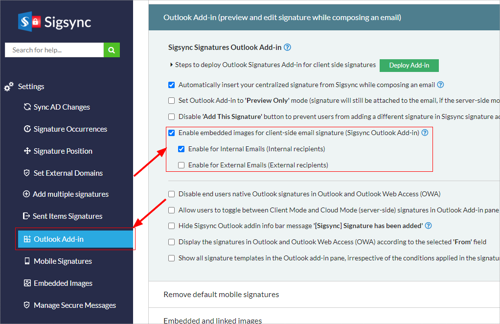 - Click the 'Outlook Add-in' tab and check the option : 'Enable embedded images for client-side email signature (Sigsync Outlook Add-in)'
