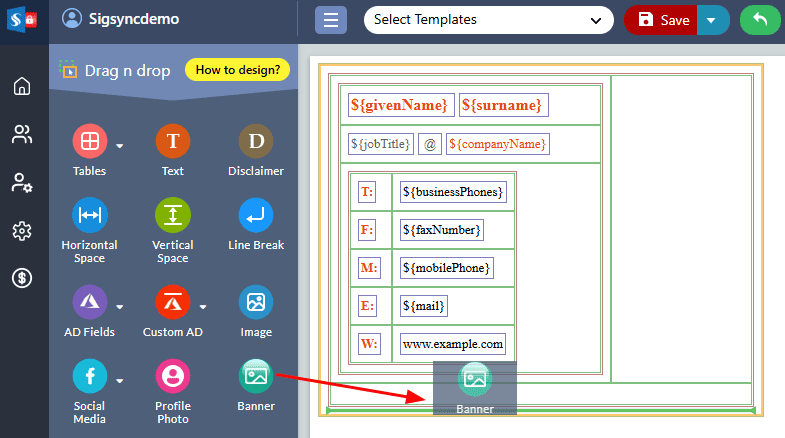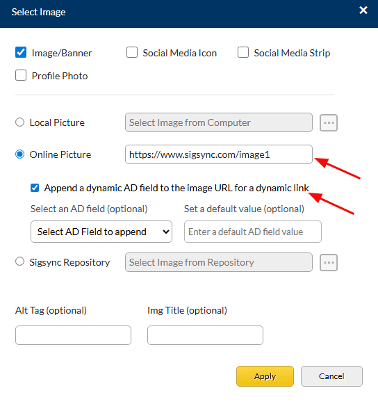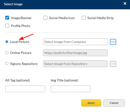 - Select the banner image either from your local drive, online URL or Sigsync repository.