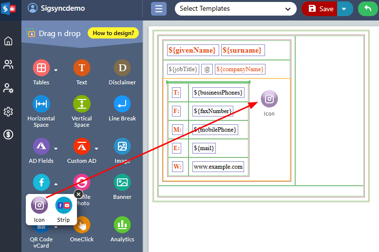 To insert icons in your email signature using the 'Icon' component in the Sigsync editor, follow the steps below: