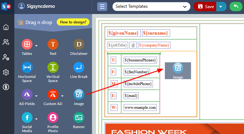 To customize the appearance of your images and icons in the Sigsync editor, simply select the desired image from the design pane and set the required properties in the 'General’ tab located on the right side of the editor.