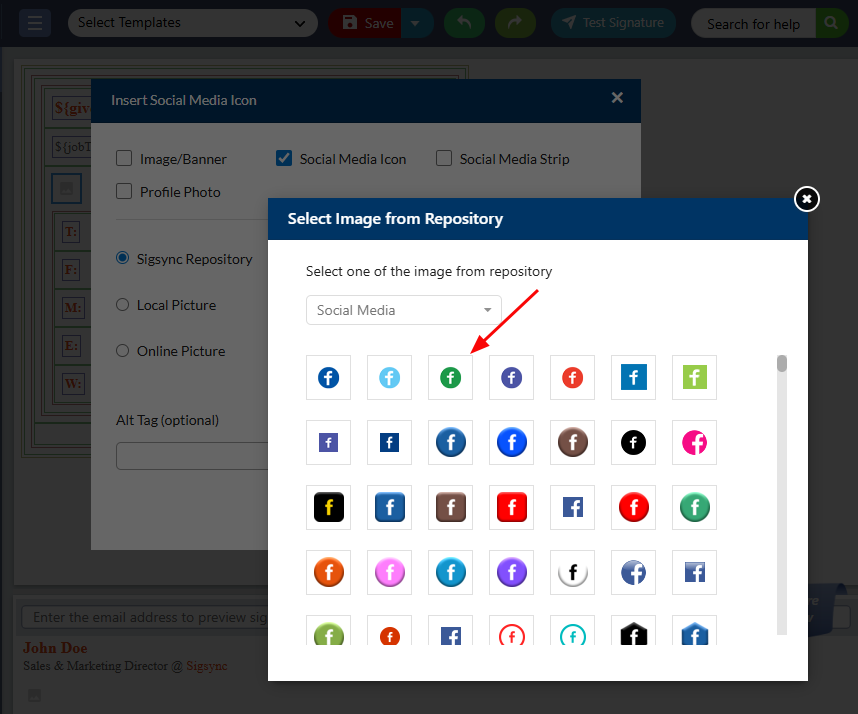 - Select the required icon from the Sigsync repository, local drive or online URL