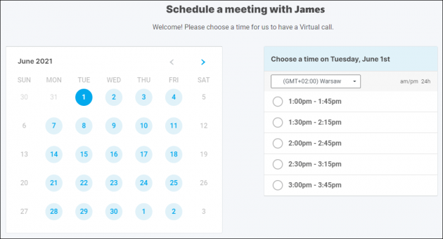 When recipient clicks the link, they will be directed to x.ai scheduling page as shown below