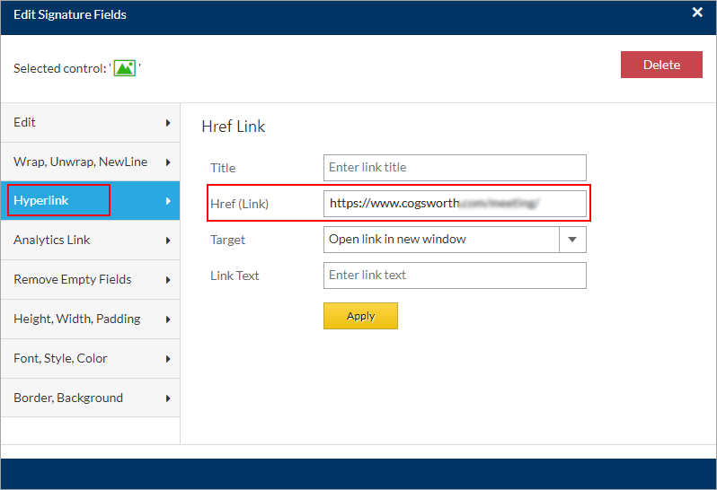 - Click on the image added in the signature. Select 'Hyperlink' in the Edit window that appears. Add the necessary information and click on the 'Apply' button.