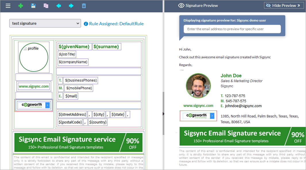 Sigsync email signature service provides effortless, centralized signature management for Office 365 and Exchange. Our team can assist you in quickly setting up company-wide signatures. Request a free on-demand demo to see how Sigsync can simplify your email signature management process.