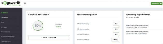 First, create an account in Cogsworth and add your users, configure services, synchronize Cogsworth and Office 365 calendar. In the top right corner of your profile, you can find a tutorial video.
