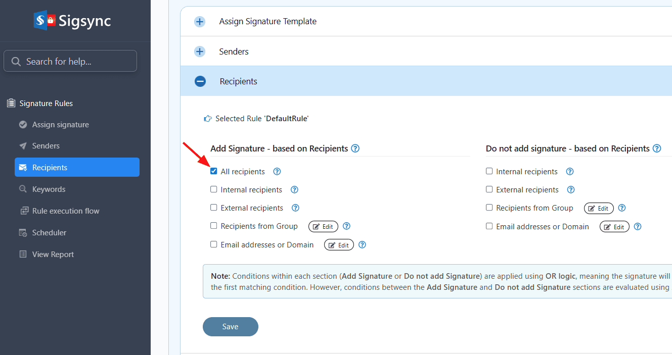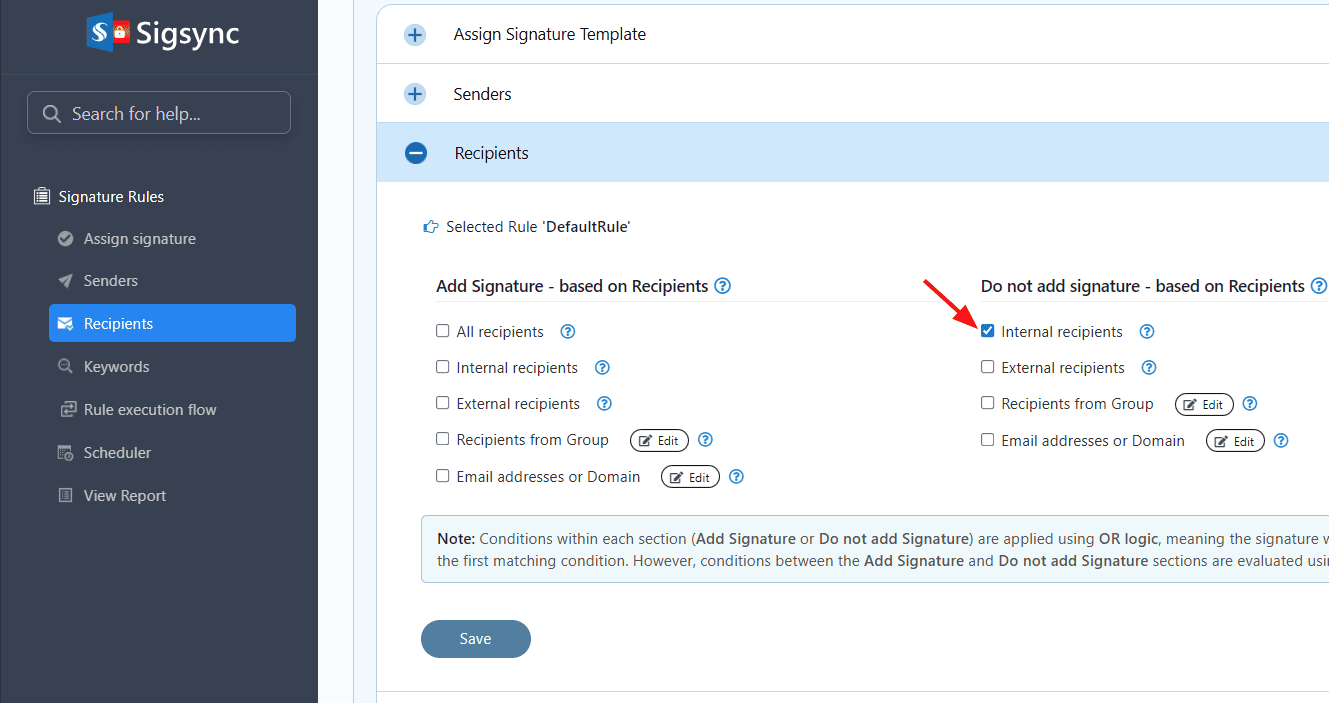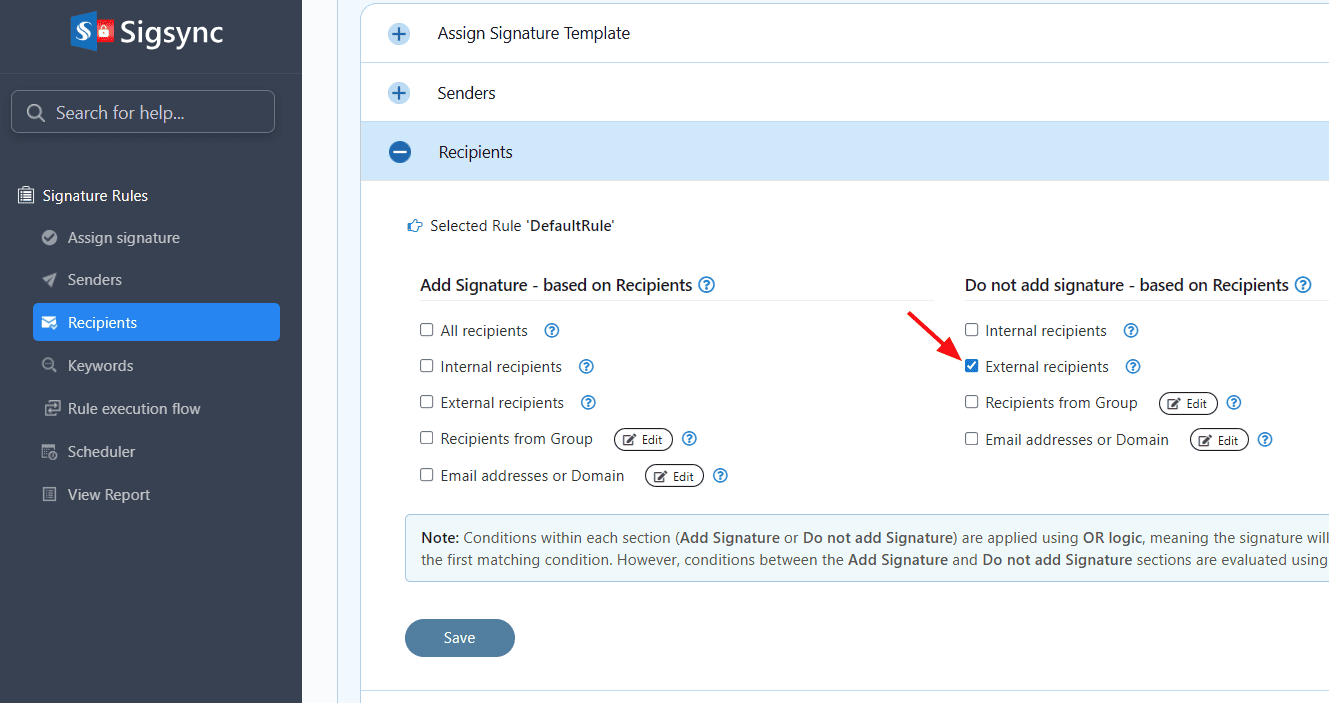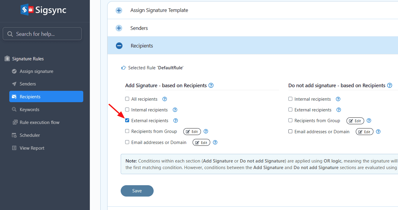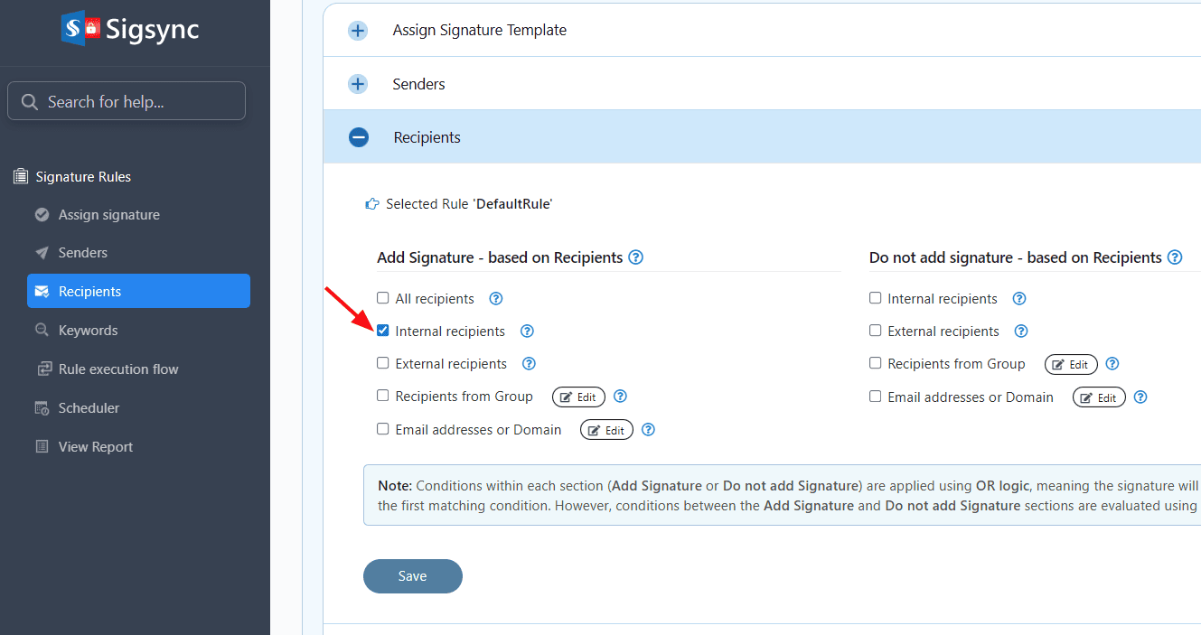 Sigsync provides an option to include the signature based on recipients. This applies if the recipient matches any of the following options: All recipients, Internal recipients, External recipients, Recipients from Group, Email addresses.