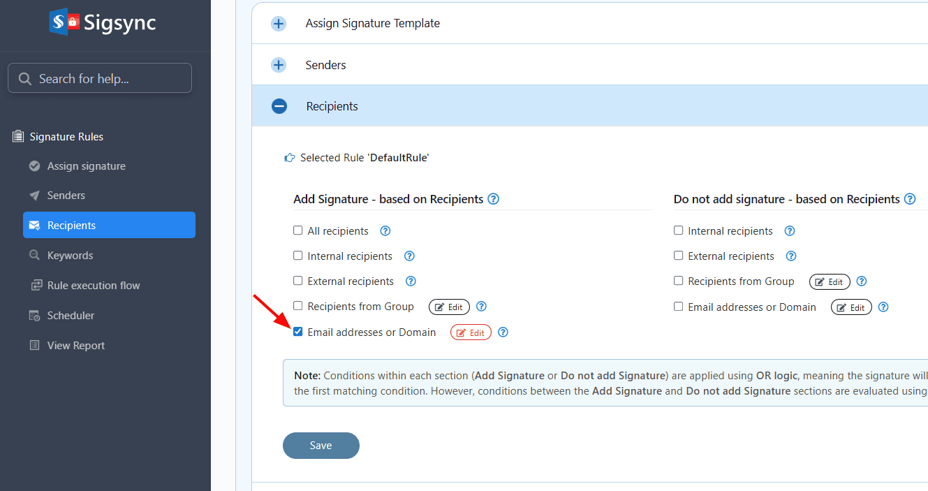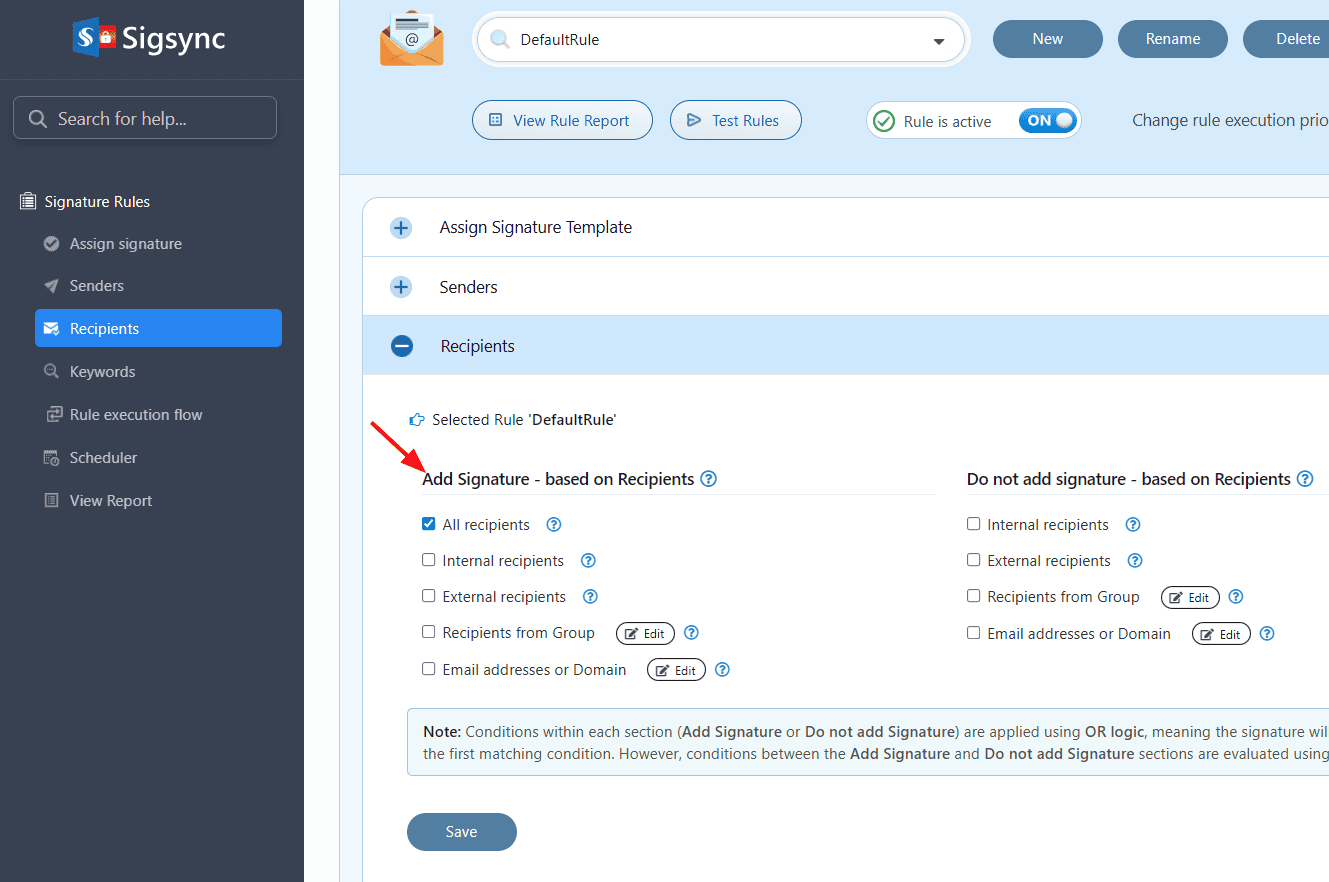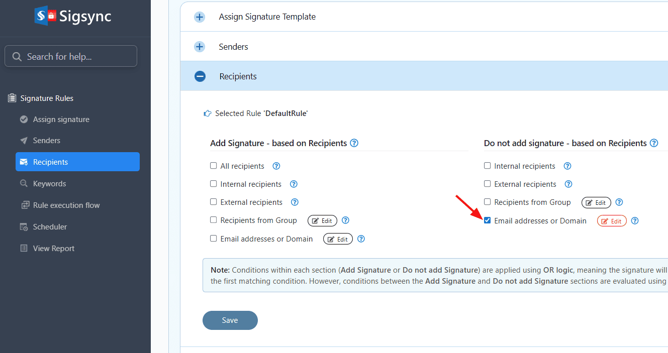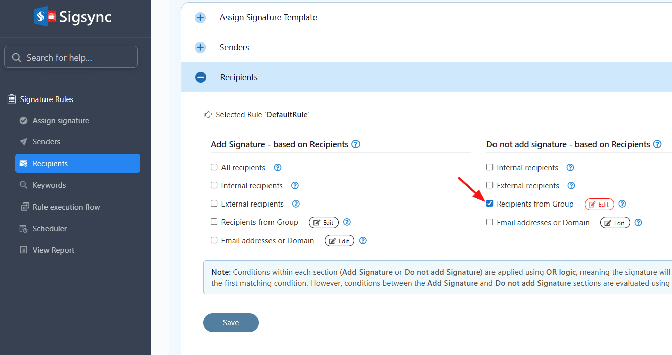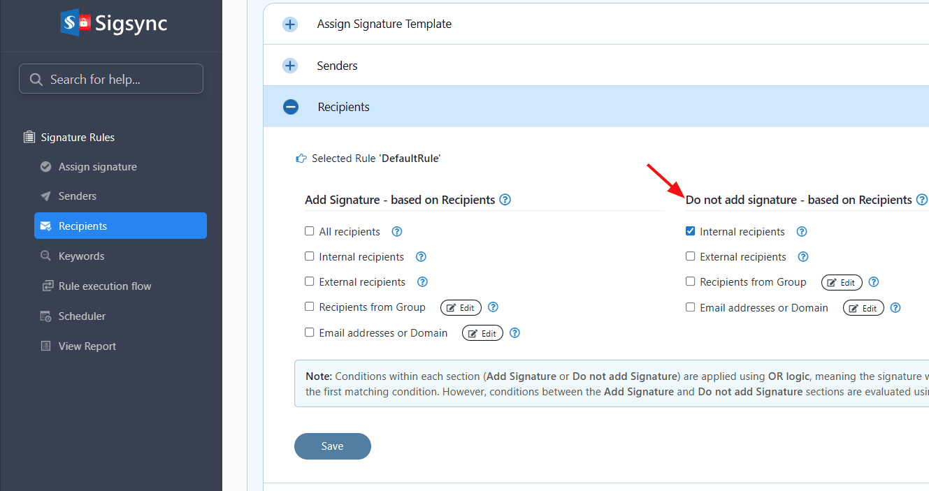 Sigsync provides an option to include the signature based on recipients. This applies if the recipient matches any of the following options: All recipients, Internal recipients, External recipients, Recipients from Group, Email addresses.