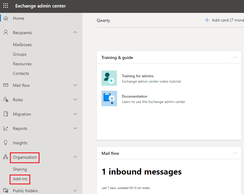 Here, navigate to the Organization section and click Add-ins.
