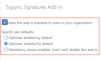 - Choose Optional, disabled by default if you want only some users to enable it. This is recommended as it is only enabled by users if they are using Sigsync signature service.