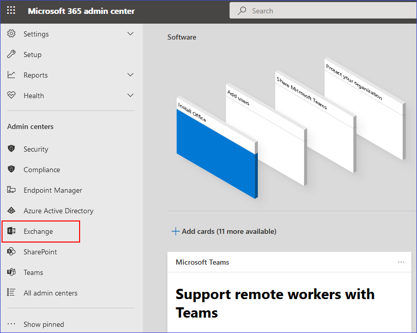 Login to your Office 365 tenant's admin center. Click Show all and navigate to Exchange shortcut as shown in the screenshot below to open the Exchange admin center in the new tab.