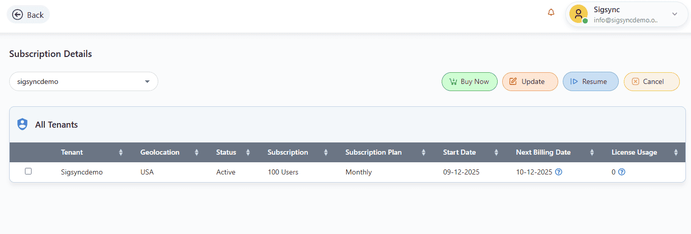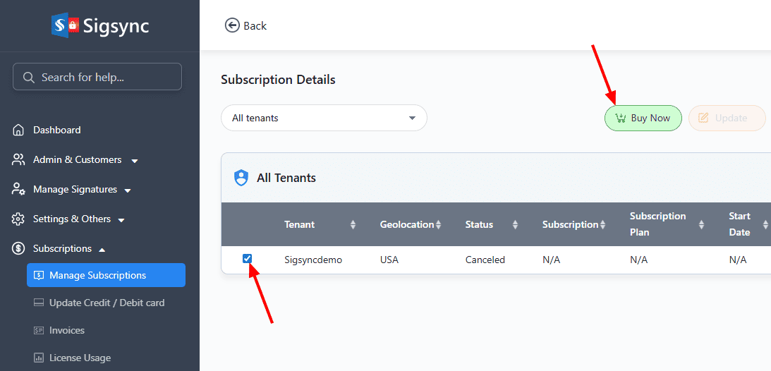 - On the Subscription Details page, select the desired Tenant and click on ‘Buy Now’.