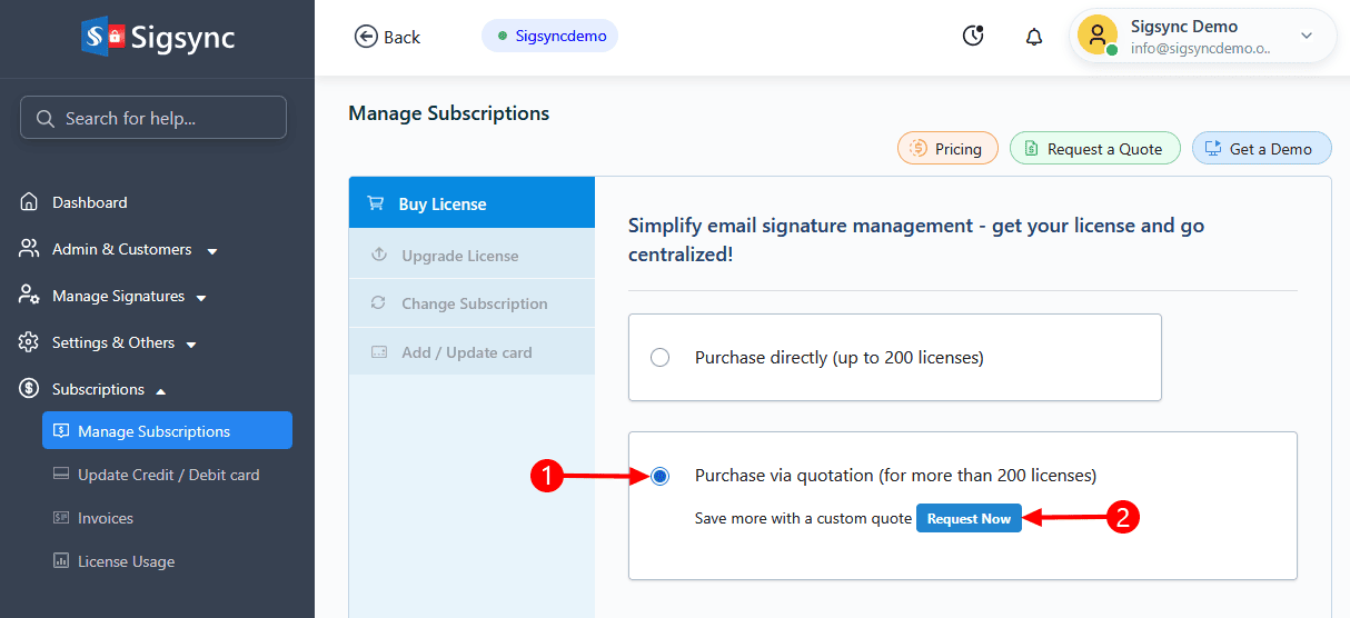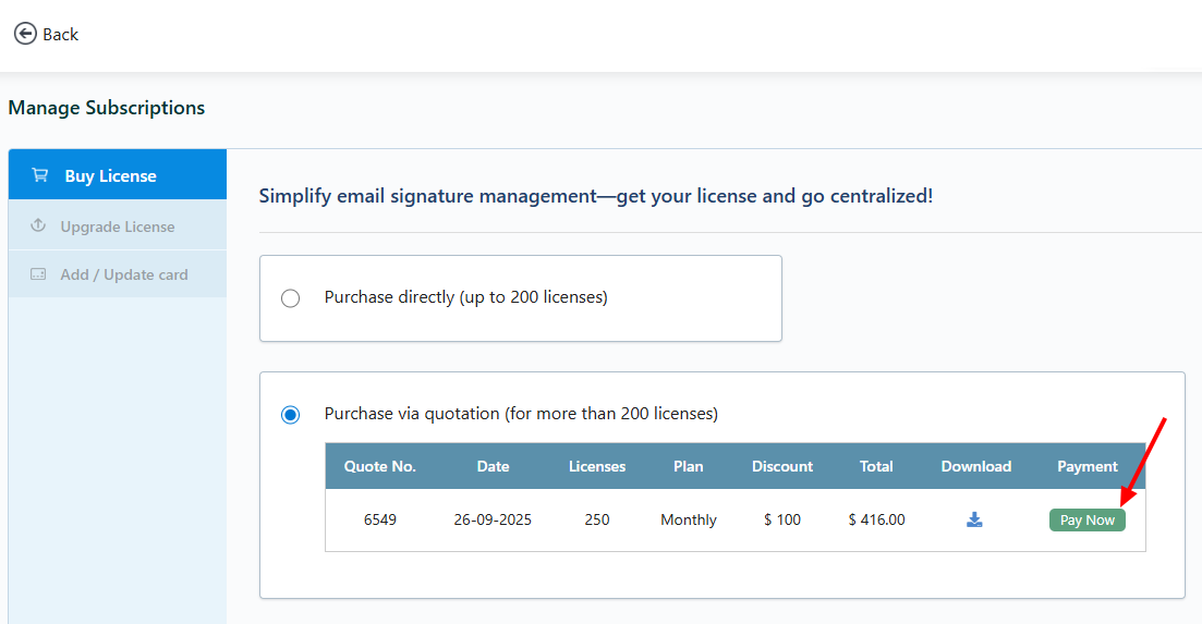 - If you are purchasing more than 200 licenses, you need to raise a quotation request. To do this, select the 'Purchase via Quotation' option and click the 'Request Now' button.