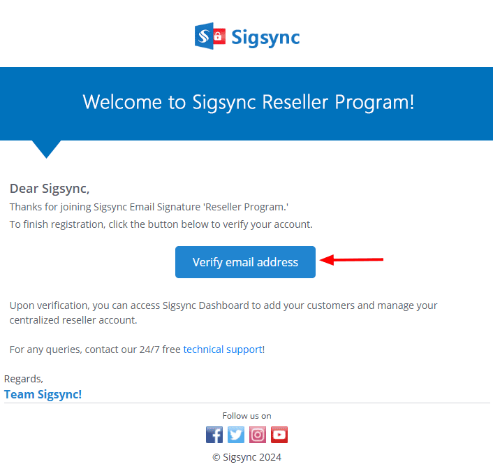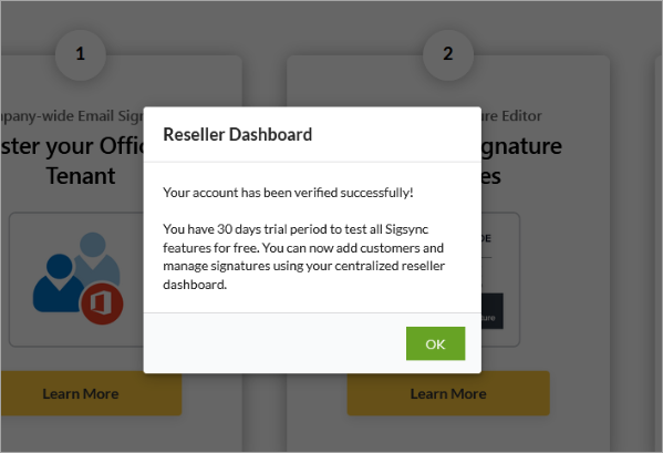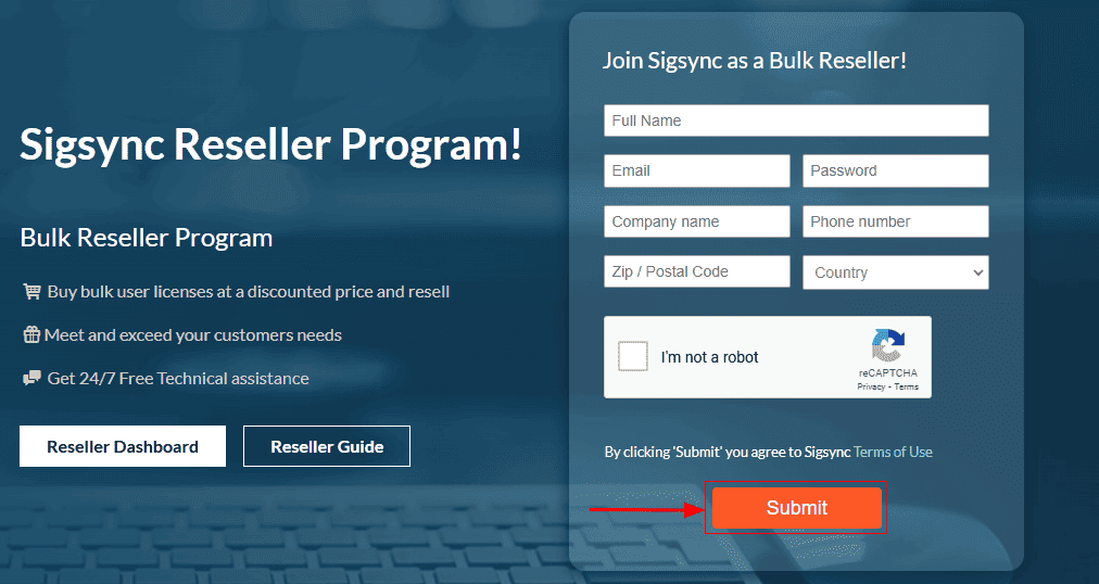 Register as a reseller and purchase the licenses in bulk with a discounted price (contact Sigsync support for a reseller discount) and earn profit by sharing the licenses among your customers. Resellers can add or invite customers and manage their signatures using the Sigsync Dashboard.