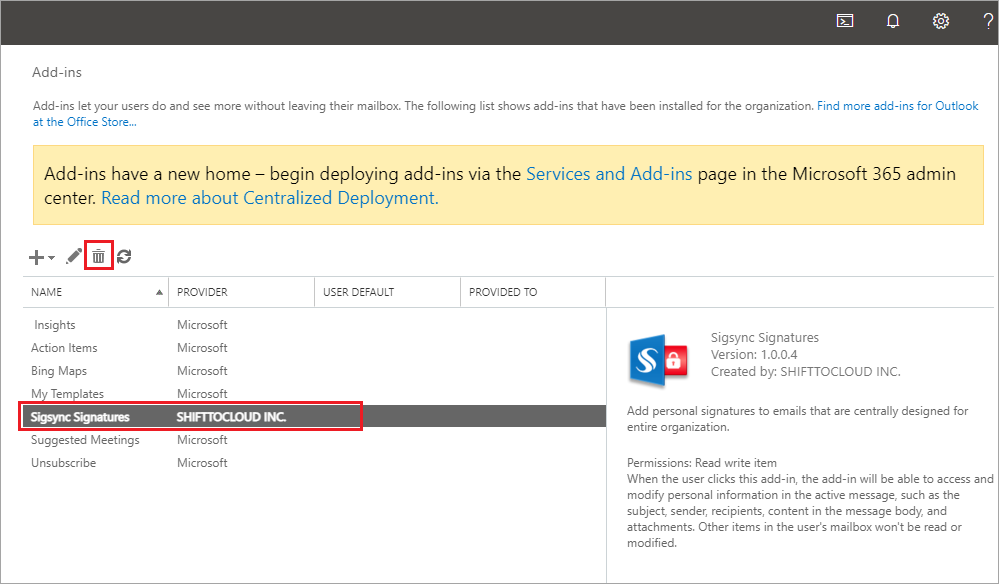 Remove Sigsync Signature Add-in for Outlook using 'Exchange add-in'