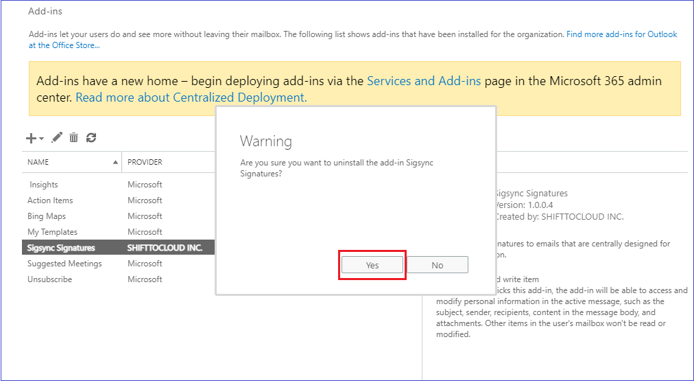 Click on the Yes button to remove the Sigsync Signatures add-in