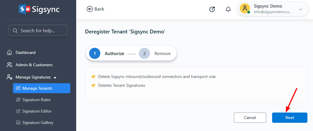 - Wait for a few minutes until the process completes. Once completed, the tenant will be removed from Sigsync, signatures will no longer be applied, and the Sigsync service will stop processing emails for this tenant. To use Sigsync again, the tenant must be registered and configured again.