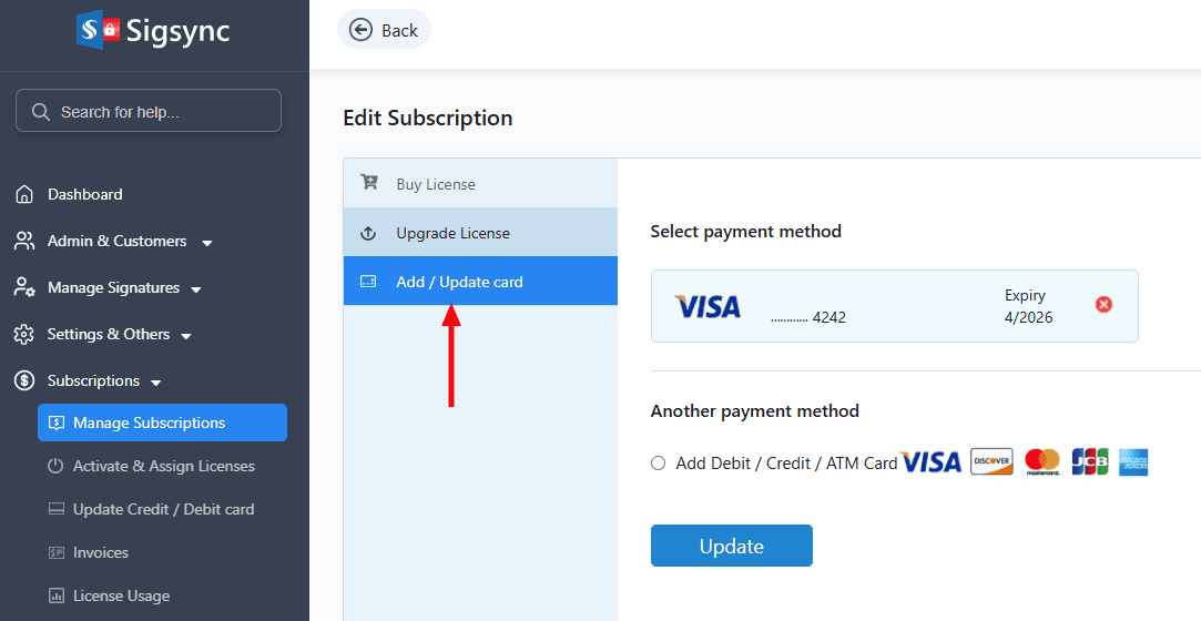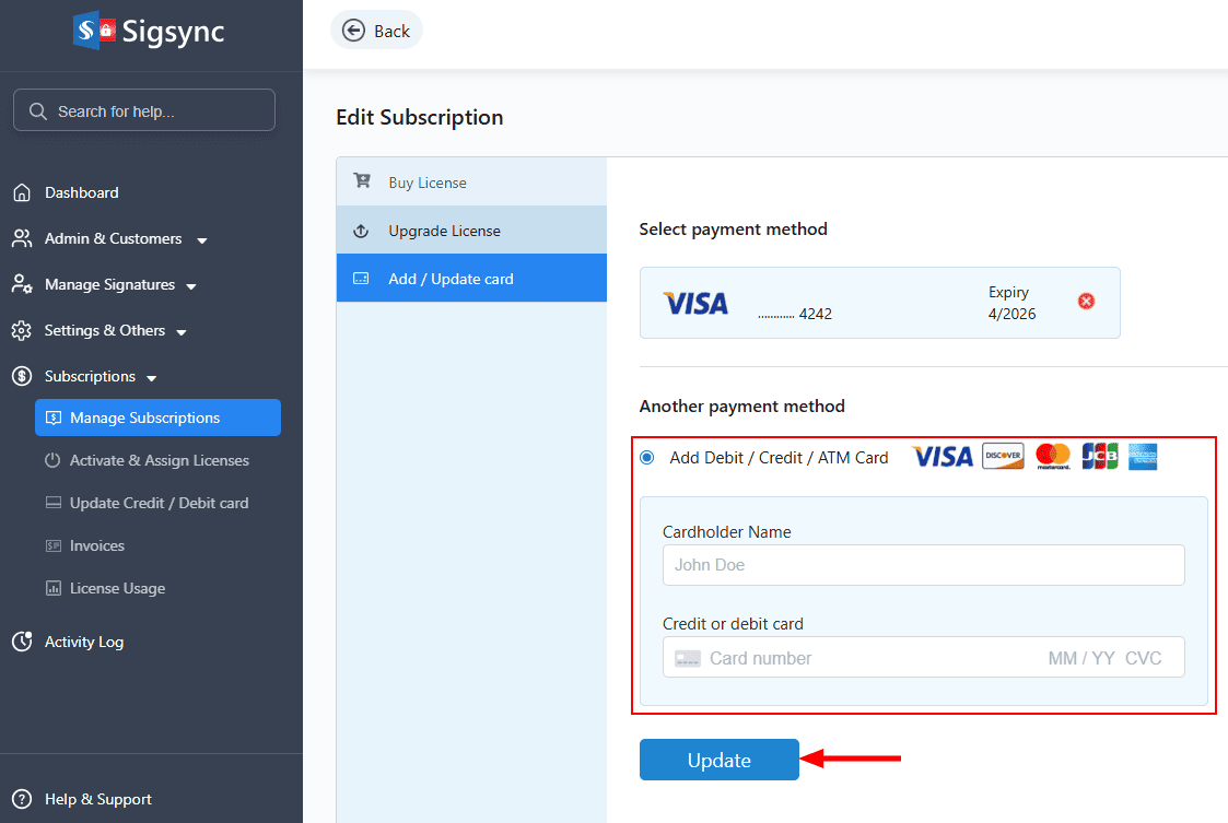 - Under the ‘Another Payment Method’ section, select Add Debit / Credit / ATM Card, enter the card details, and click the ‘Update’ button.