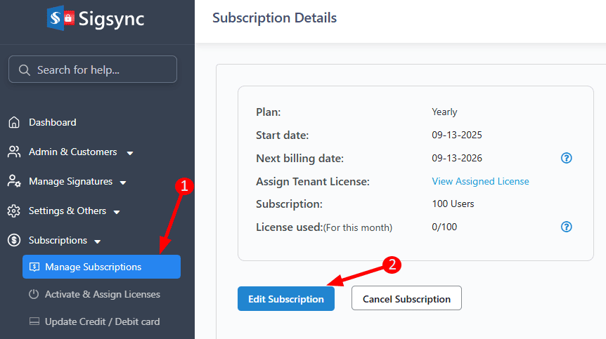 - Go to Subscriptions > Manage Subscriptions tab, then click the ‘Edit Subscription’ button.