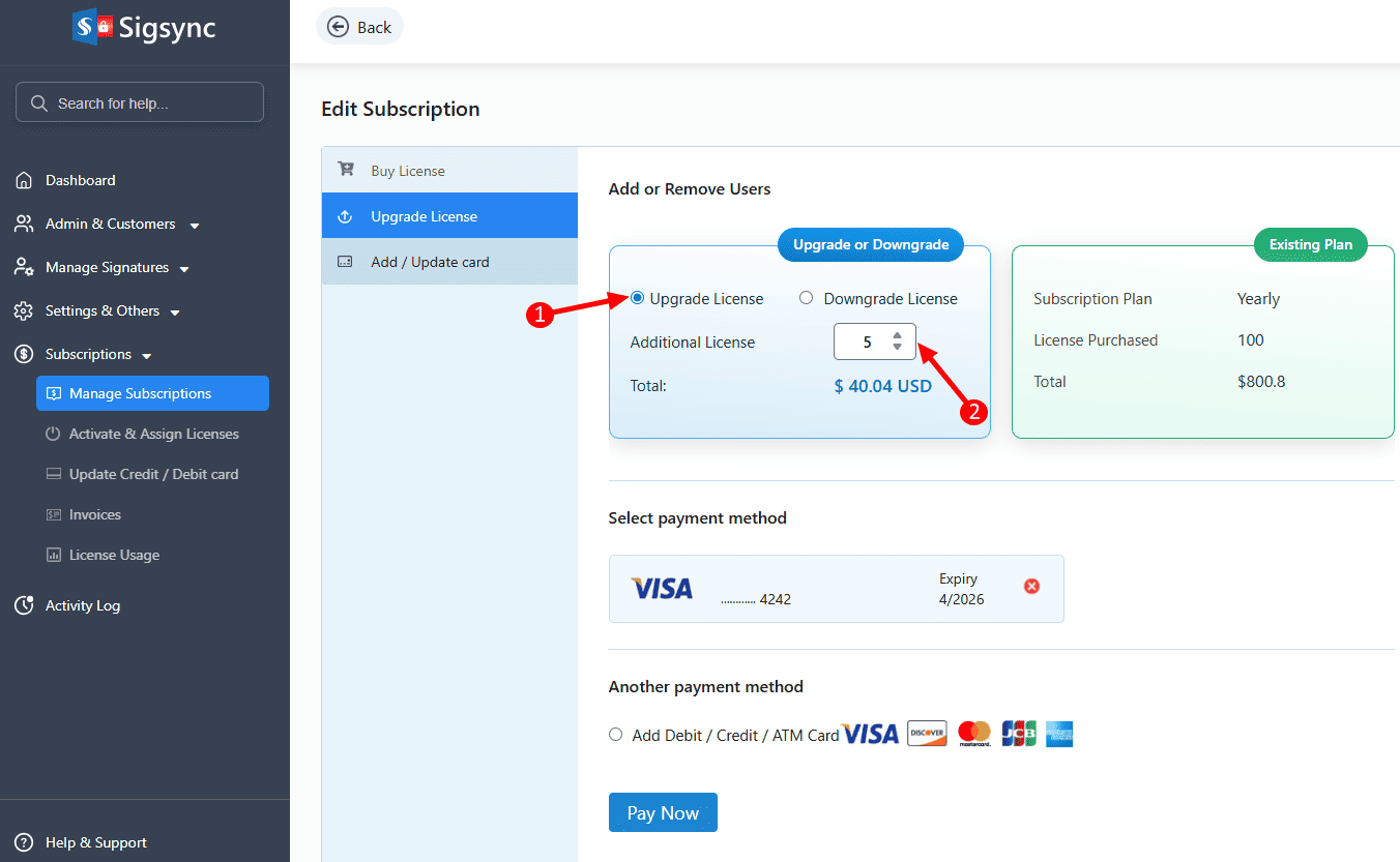 - Now, select the ‘Upgrade License’ option. Enter the number of licenses to upgrade, or use the Up arrow (▲) and Down arrow (▼) to adjust the value.