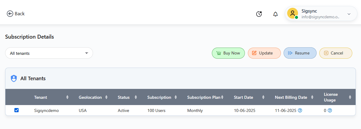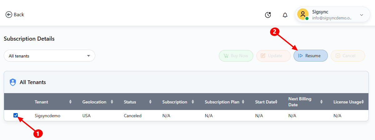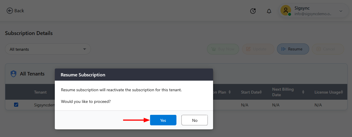 If you have cancelled the subscription, then it can be resumed before the subscription period ends. If you resume the subscription, it will reactivate the subscription for the particular tenant.