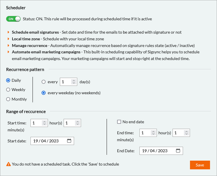- Set the time and date for the email signature to be activated using the Scheduler.