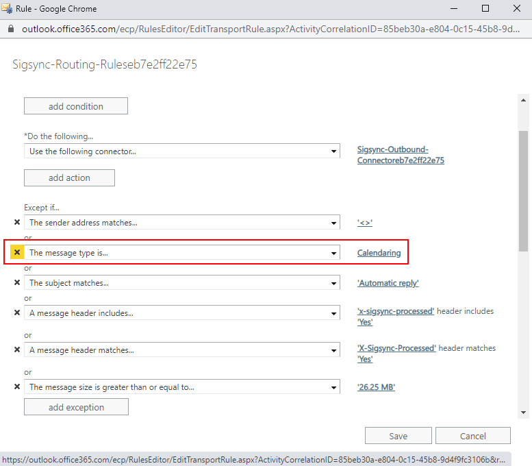 - In the Rules window, remove the exception: The message type is… ‘Calendaring’ and click on the Save button. Wait for a few minutes for the changes to reflect on the Sigsync Email Signature services.