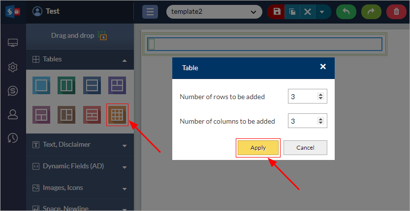 Custom table adds different place holders in the intended row / column to create a unique email signature. Drag and drop the 'Custom Table' into the signature design area and select the number of rows and columns to be added in the table and then click the 'Apply' button.