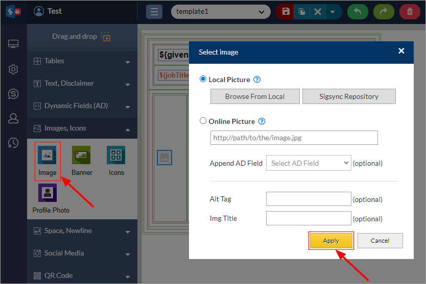 Drag and drop the 'Image' component into the signature design area. Select the image either from your computer or Sigsync repository or you can also load an online image by entering the complete URL. The loaded images can be resized according to your requirements. Enter the appropriate width and height in pixels. Click on the 'Apply' button to apply the changes. Repeat the same procedure to load multiple images.