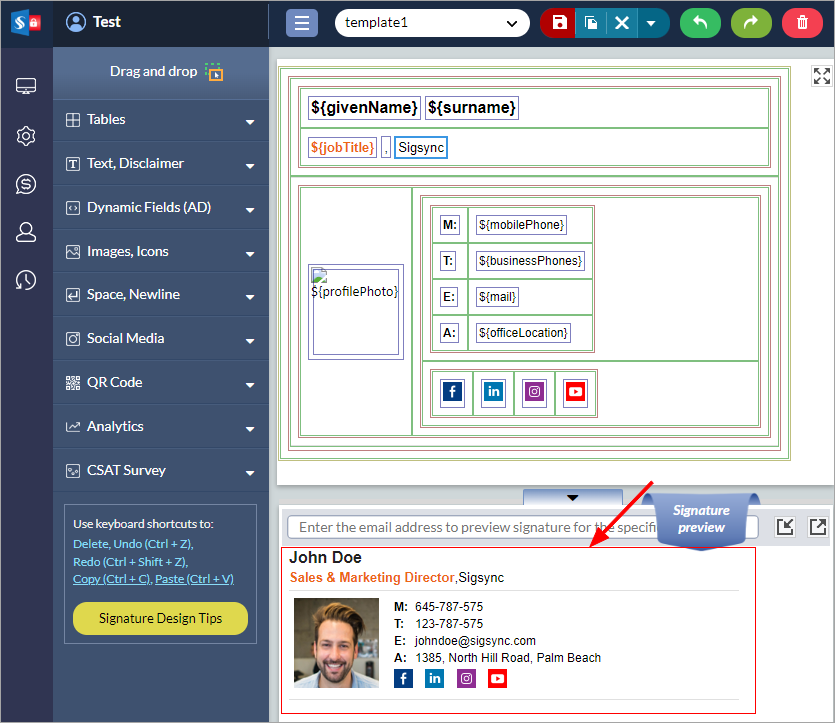 You need to create a table with separate cells for each of your images in the signature generator to place them next to each other. By using tables, you can ensure that your images appear properly across all platforms and always stay inline. Aligning multiple images side by side requires you to use the following signature components in Sigsync Office 365 Email signature service.