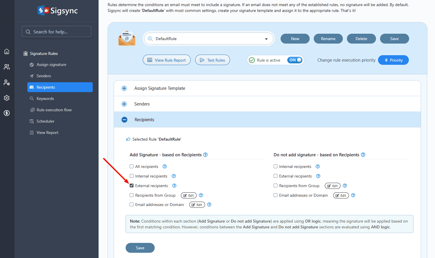 Check the ‘External recipients’ in the ‘Recipients’ tab under ‘Signature Rules’.