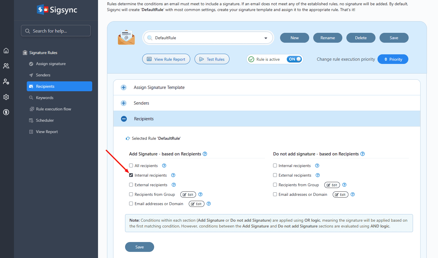 Check the ‘Internal recipients’ in the ‘Recipients’ tab under ‘Signature Rules’.