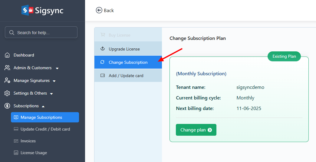 How to change a subscription plan in Sigsync Email Signatures?